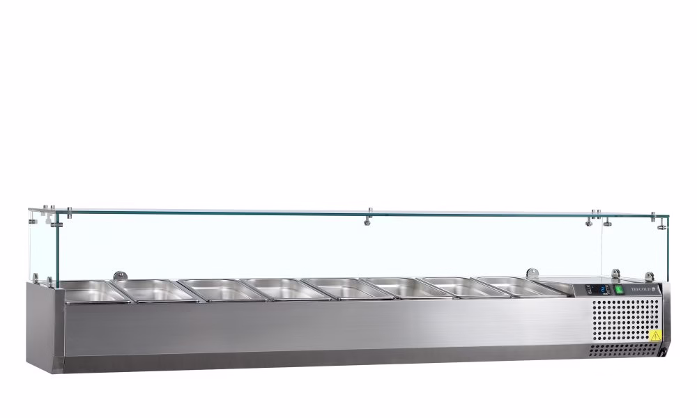 Serija VK hladilnih vitrin je odličen dodatek za gastro pulte, saj boste imeli vse, kar potrebujete za pripravo hrane, na dosegu roke. Sprejme posode GN1/3, GN1/6 in GN1/2 (niso priložene). Zamrzovalnik je izdelan iz nerjavečega jekla SS304 s stekleno zaščito za hrano. Je kot nalašč za picerije, restavracije s hitro prehrano in trgovine s sendviči.