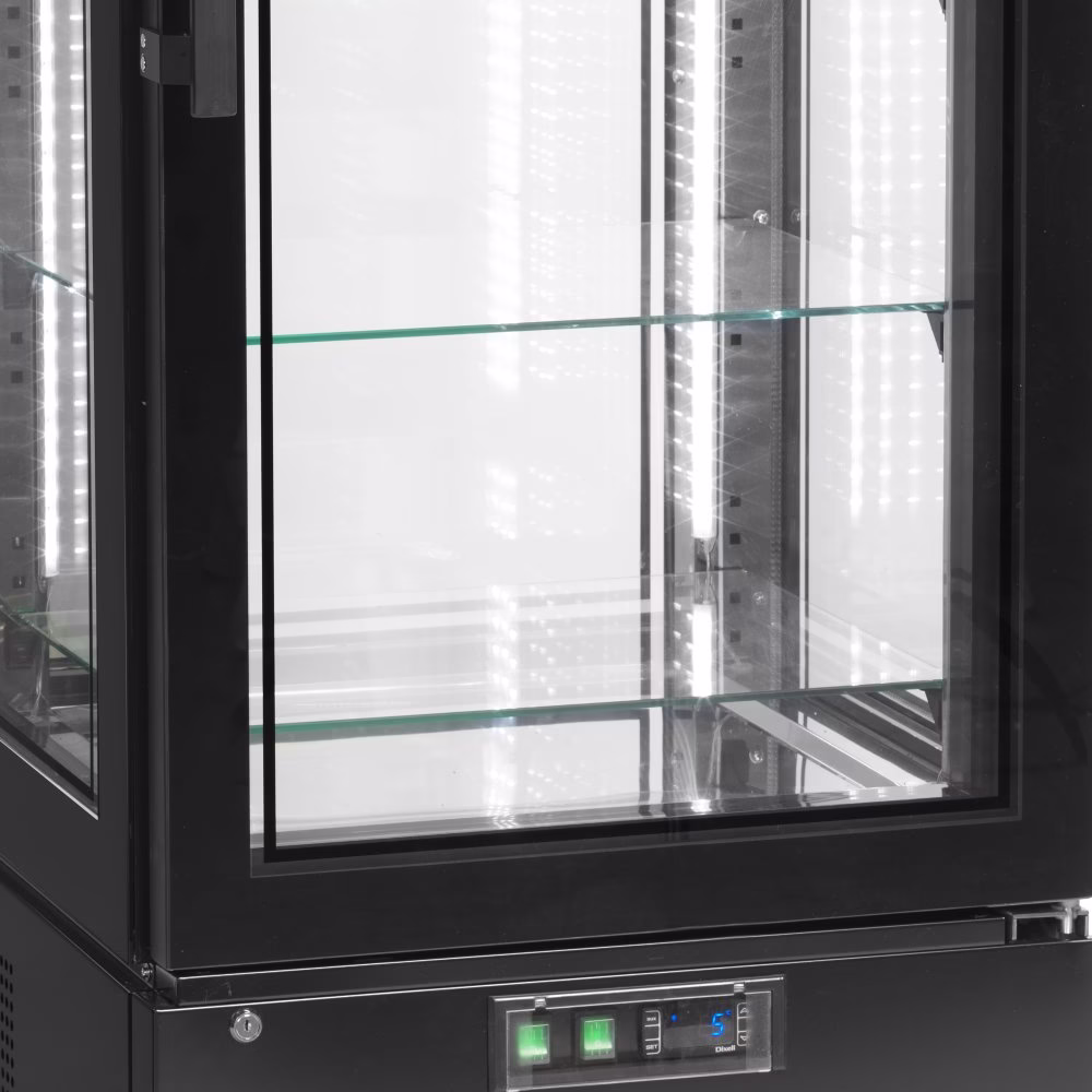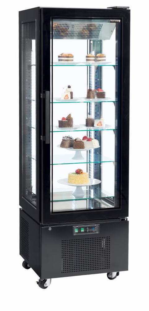 Steklena vitrina UPD400-C je elegantna rešitev za razstavljanje tort in sladic. Vitrina ima na vseh straneh dvojno zastekljeno steklo, vključno s steklenimi vrati brez okvirja. Ima elegantno zasnovo s črnim zunanjim delom iz jekla, notranjostjo iz nerjavečega jekla, 5 nastavljivimi steklenimi policami in LED-osvetlitvijo.