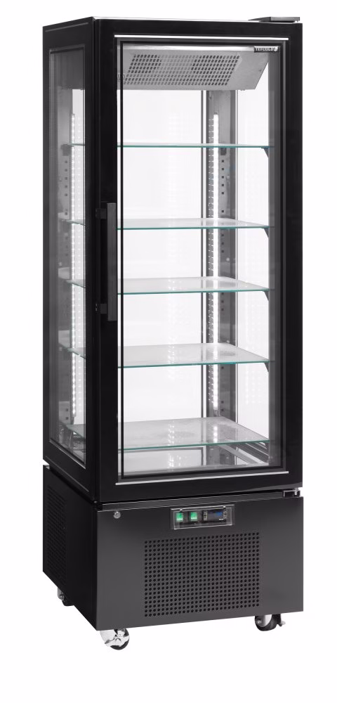 Steklena vitrina UPD400-F je elegantna rešitev za razstavljanje sladic. Zamrzovalnik ima na vseh straneh dvojno zastekljeno steklo, vključno s steklenimi vrati brez okvirja. Ima elegantno zasnovo s črnim zunanjim delom iz jekla, notranjostjo iz nerjavečega jekla, 5 nastavljivimi steklenimi policami in LED-osvetlitvijo.