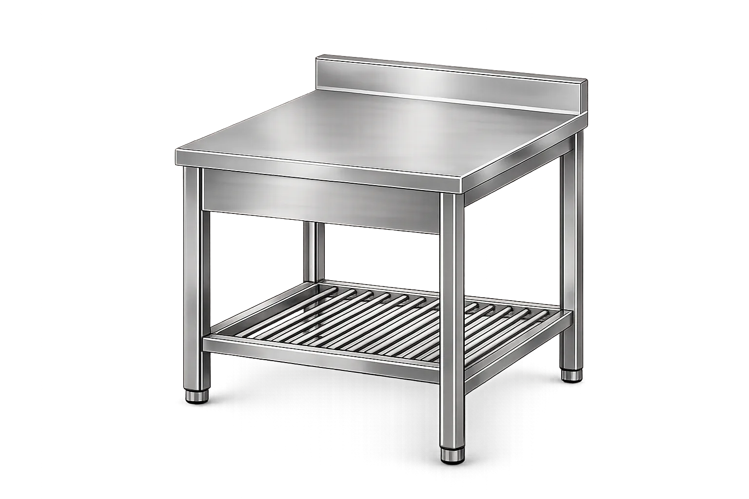 Profesionalna inox delovna miza z zadnjim robom in rešetkasto spodnjo polico, izdelana iz AISI 304 nerjavečega jekla. Idealna za postavitev ob steno v zahtevnih kuhinjskih okoljih.