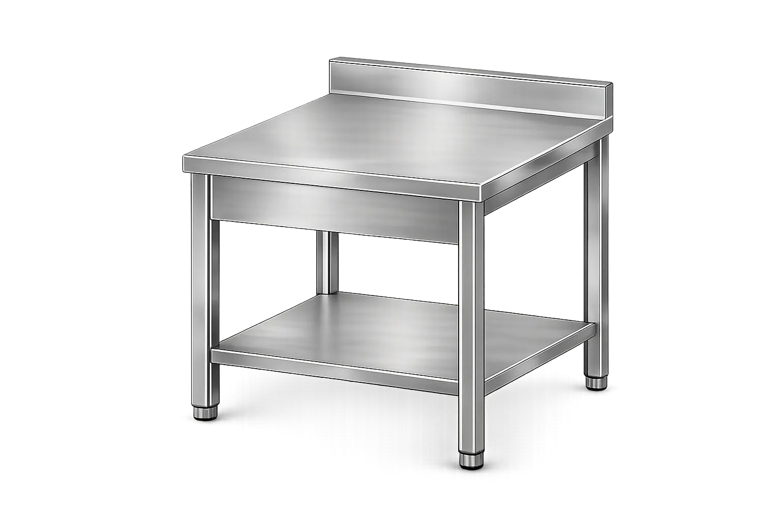 Profesionalna inox delovna miza z zadnjim robom in spodnjo polico, izdelana iz AISI 304 nerjavečega jekla. Idealna za postavitev ob steno v profesionalnih kuhinjah.