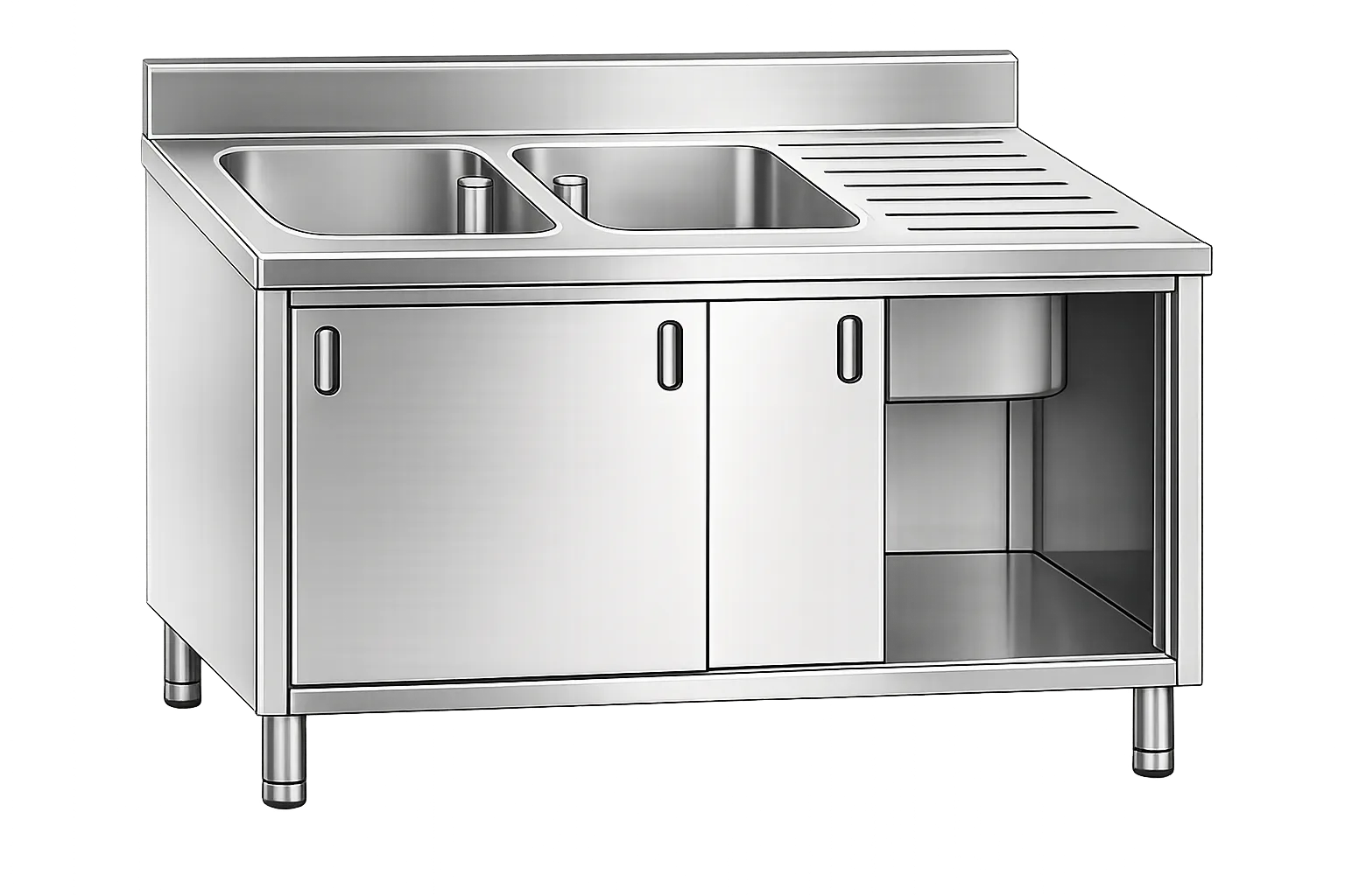 Profesionalno inox pomivalno korito z omarico in vratci, izdelano iz AISI 304 nerjavečega jekla. Namenjeno intenzivni uporabi in večjim pomivalnim procesom v profesionalnih kuhinjah.