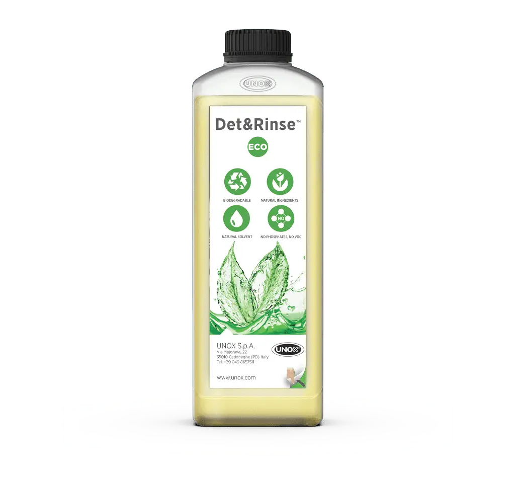 UNOX DB1018A0 DET&RINSE ECO je profesionalno čistilo za avtomatske pralne sisteme v UNOX konvektomatih, razvito z okolju prijazno formulo za vsakodnevno uporabo. Namenjeno je učinkovitemu odstranjevanju ostankov hrane in maščob, hkrati pa zmanjšuje vpliv na okolje.