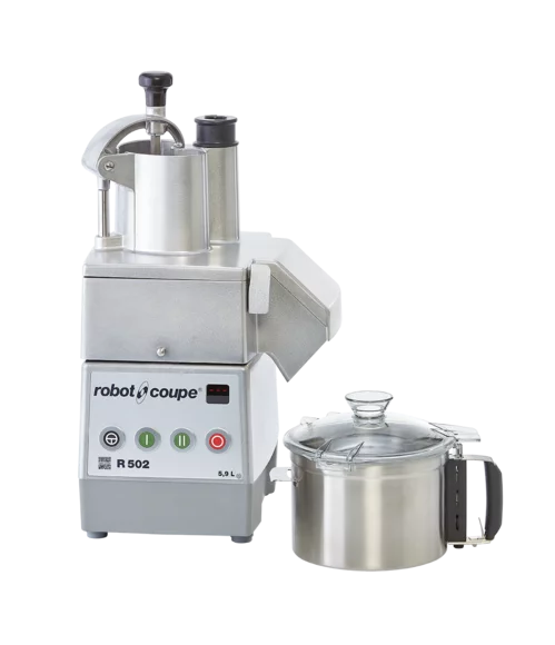 R 502 Kuhinjski robot: rezalnik in rezalnik za zelenjavo, opremljen z rezalnim nastavkom za sekljanje, drobljenje, emulzije, mletje in gnetenje ter nastavkom za pripravo zelenjave za rezanje, strganje, rezanje valovitih rezin, julienne, kockice in pripravo pomfrita.