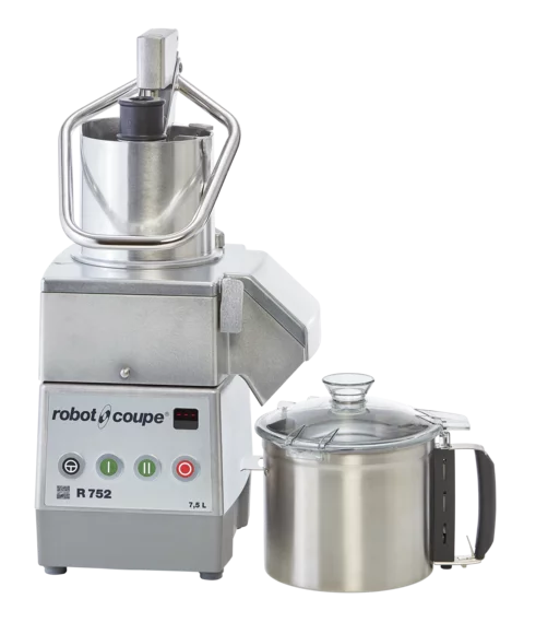 R 752 Kuhinjski robot: rezalnik in rezalnik za zelenjavo, opremljen z rezalnim nastavkom za sekljanje, drobljenje, emulzije, mletje in gnetenje ter nastavkom za pripravo zelenjave za rezanje, strganje, rezanje valovitih rezin, julienne, kockice in pripravo pomfrita.