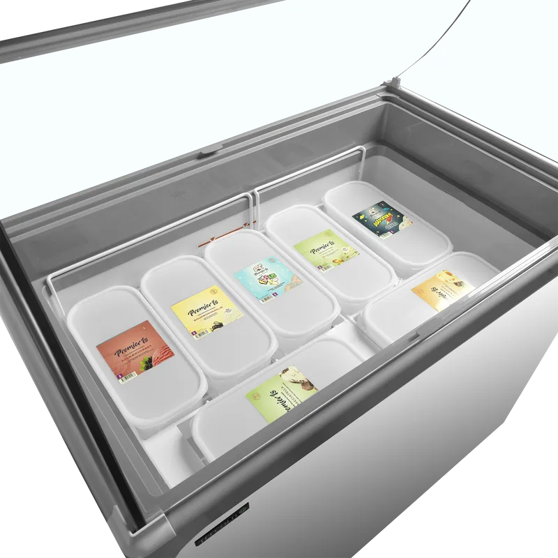 Serija zamrzovalnikov za sladoled NIC-SC-SO ponuja eleganten dizajn po dostopni ceni. Ima zaobljene kote, zaobljene robove, ravne drsne steklene pokrove in zaobljeno stekleno strešno okno. Z notranjo LED-osvetlitvijo na sprednji strani je vaš sladoled vedno lepo razstavljen. Opremljen je s kolesi za odlično mobilnost. Upoštevajte, da je zamrzovalnik opremljen s standardnimi košarami, če pa potrebujete košare, primerne za 5-litrske posode za sladoled, so te na voljo kot dodatna oprema. Tip in število je treba naročiti v rubriki dodatki. Te košare so primerne za 5-litrske plastične posode – posode Napoli vanje ne bodo pasale