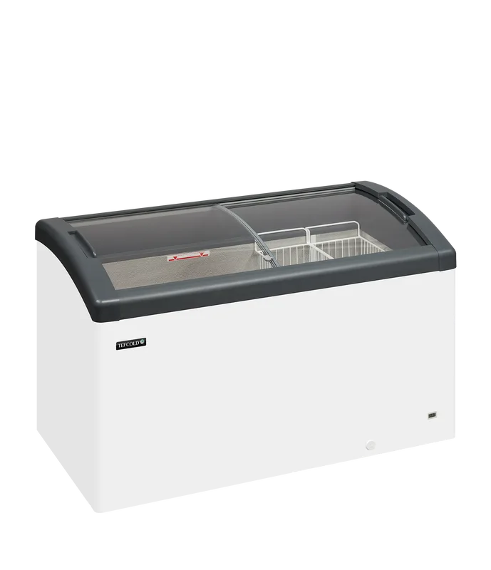 Zamrzovalna skrinja z ukrivljenimi drsnimi steklenimi pokrovi
