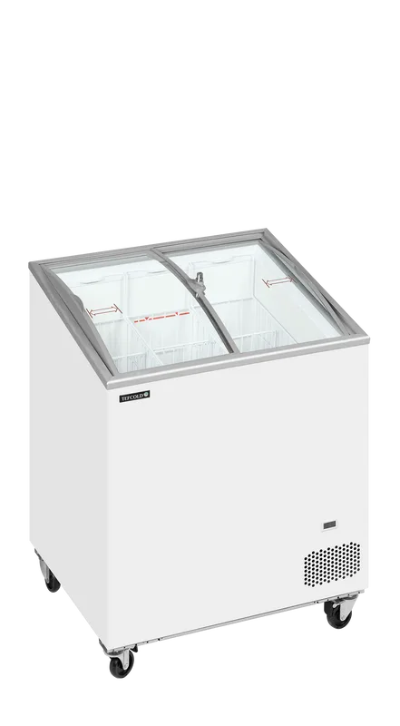 Zamrzovalna skrinja z ukrivljenim drsnim steklenim pokrovom.