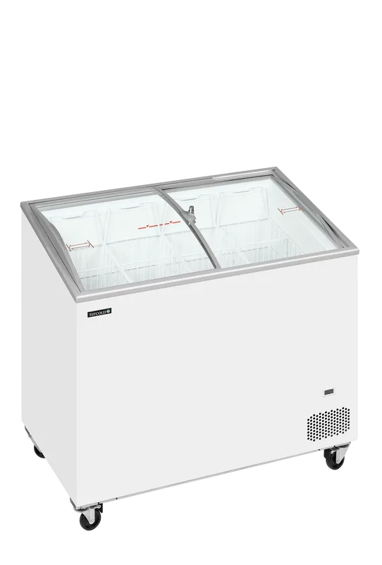 Zamrzovalna skrinja z ukrivljenim drsnim steklenim pokrovom.