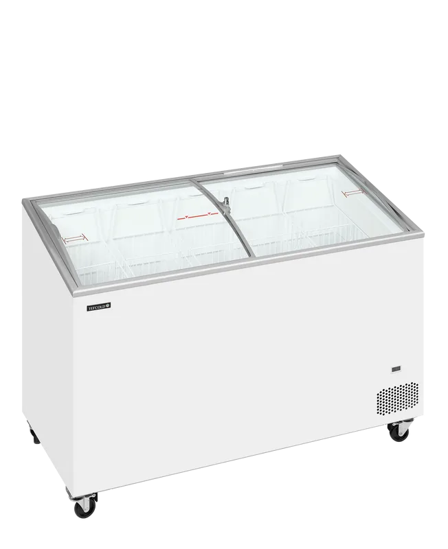 Zamrzovalna skrinja z ukrivljenim drsnim steklenim pokrovom.